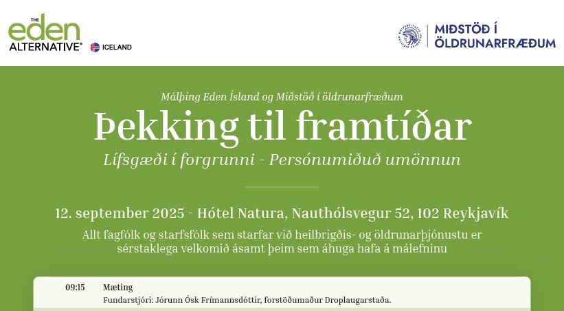 Eden Ísland og Miðstöð í öldrunarfræðum halda málþing þann 12. september n.k. um öldrunarmál: Þekking til framtíðar – Lífsgæði í forgrunni – Persónumiðuð umönnun.